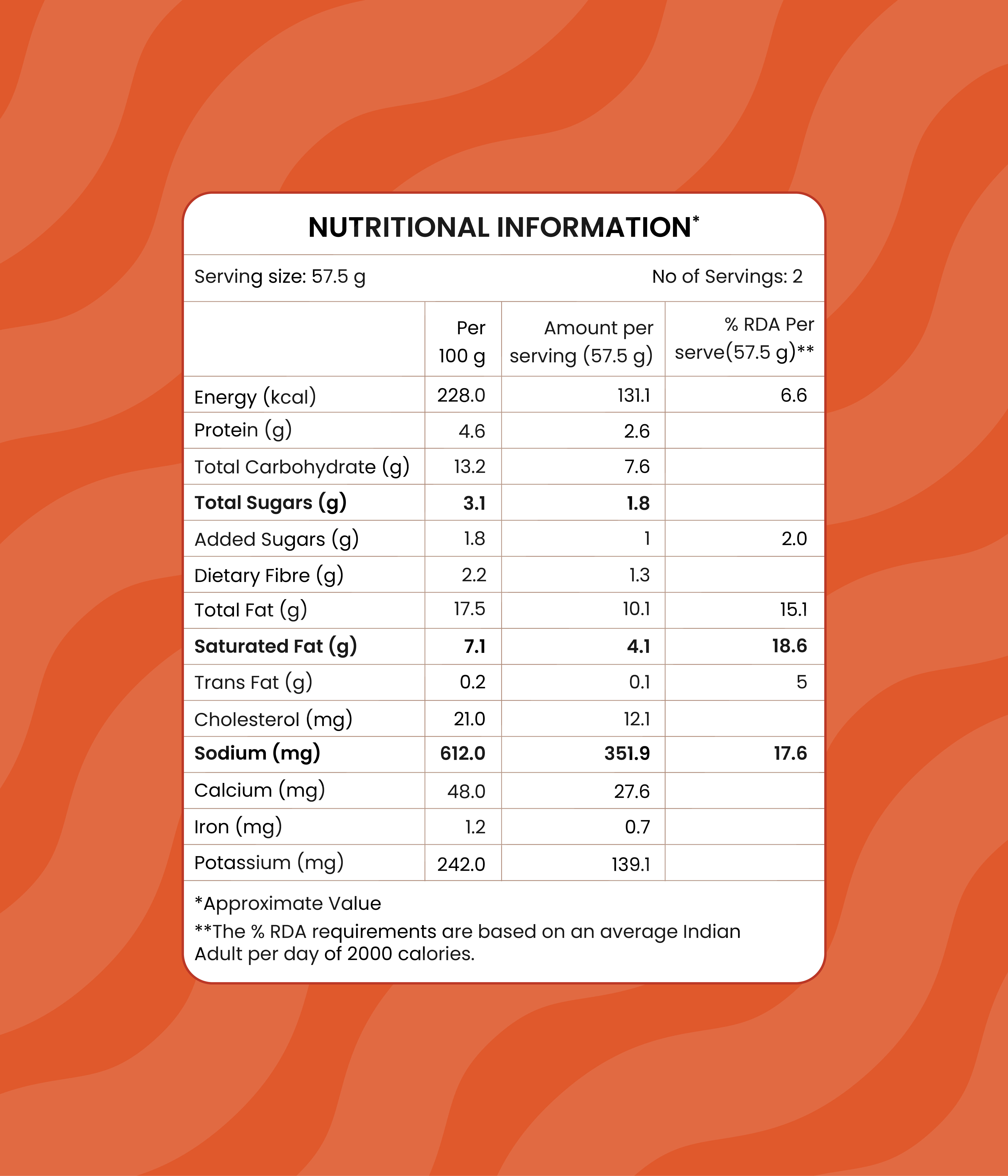 Chick Peas (15%), Milk, Onion, Tomato, Fresh Cream, Ghee, Cashew Nut, Ginger, Garlic, Salt, Butter, Sugar and Spices & Condiments (Various spices including Clove, Cinnamon, Cardamom, Red Chilli and Mixed Masalas) |