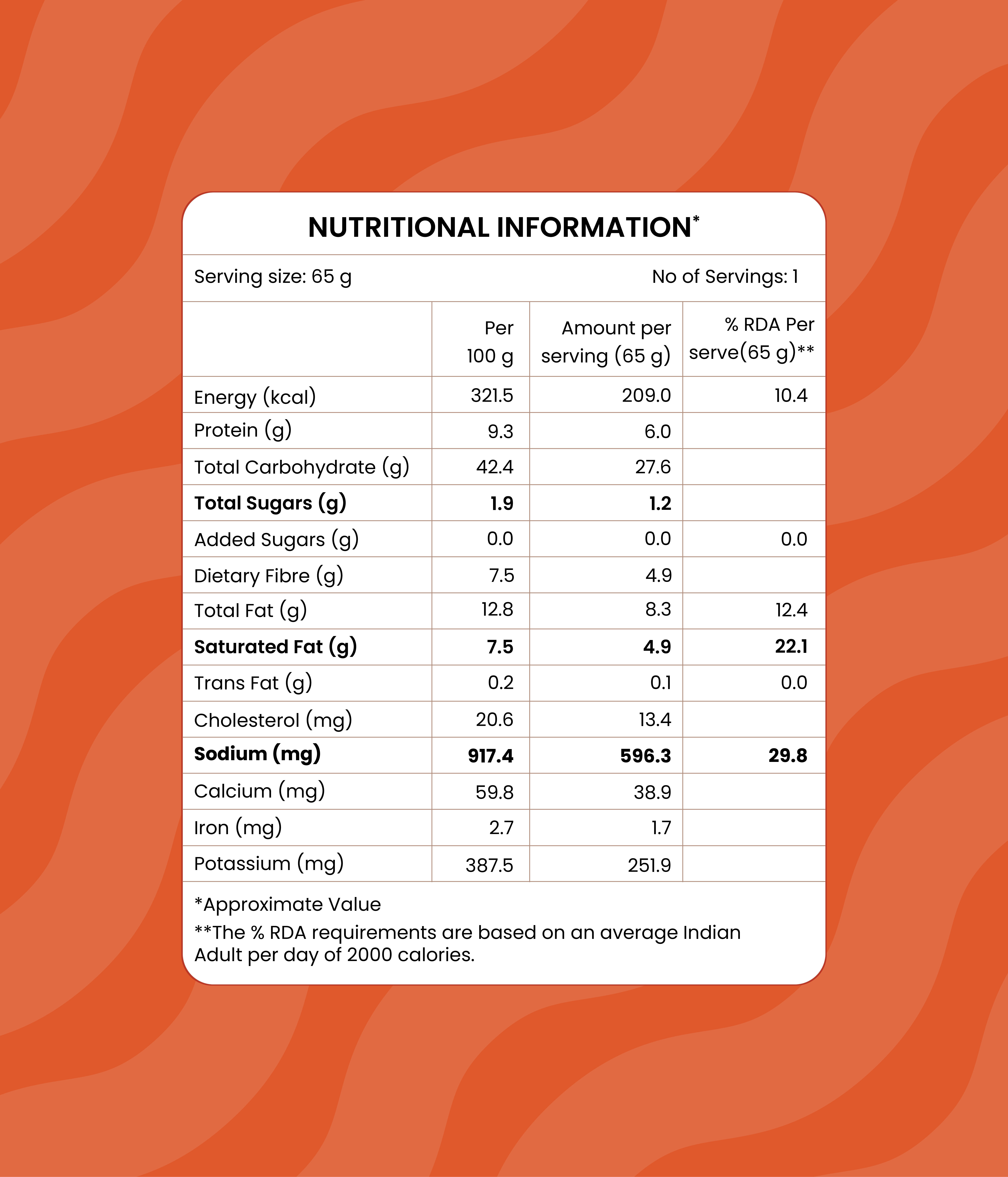 Potato Fry: Potato (92%), Edible Vegetable Oil (Sunflower), Salt, Spices & Condiments.