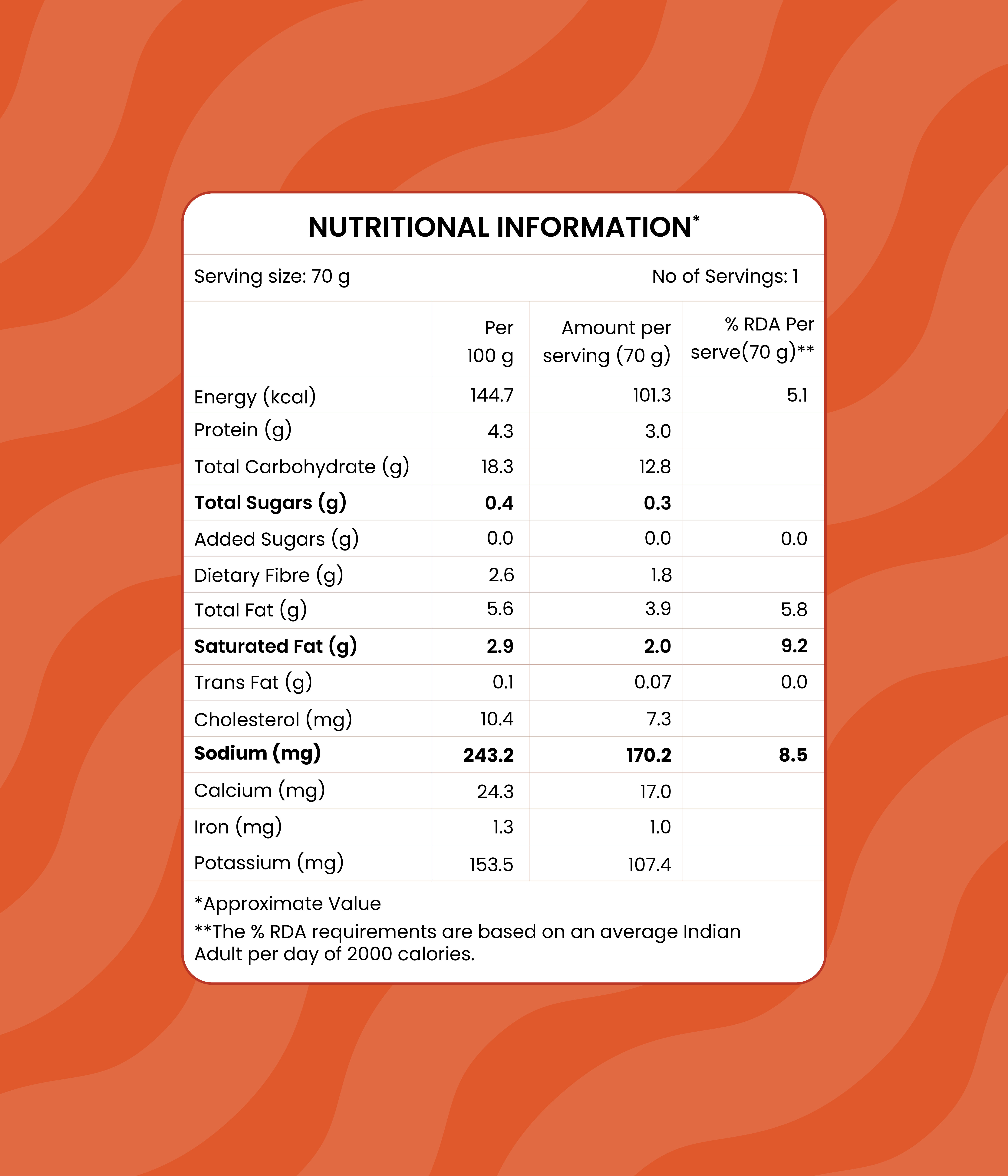 Coconut Chutney: Coconut (74%), Bengal Gram Dal (13%), Green Chilli, Edible Vegetable Oil (Sunflower Oil), Salt, Ginger, Curry Leaves, Mustard Seed, Urad Dal, Red Chilli & Asafoetoda